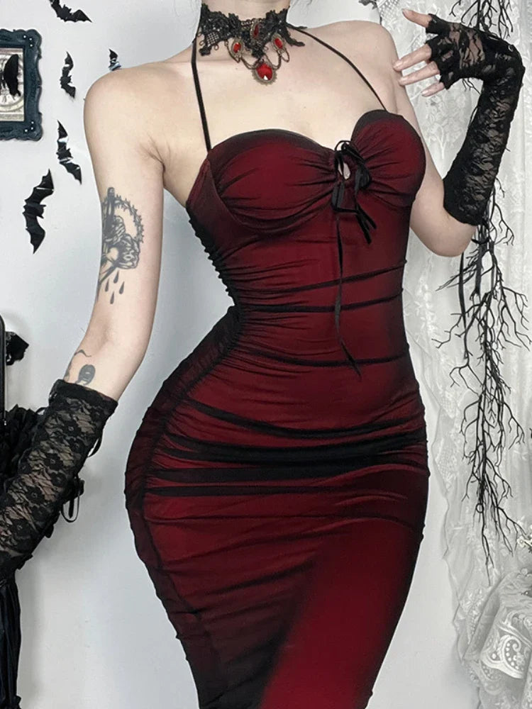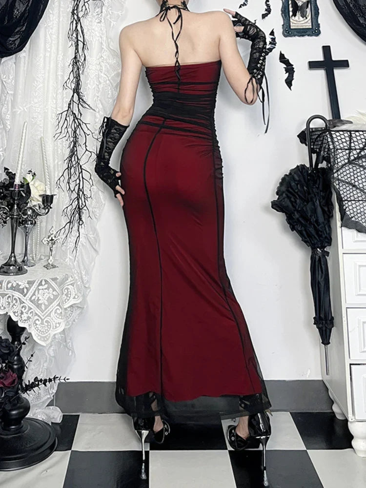 Bordeaux lange gotische zeemeerminjurk met split en kant