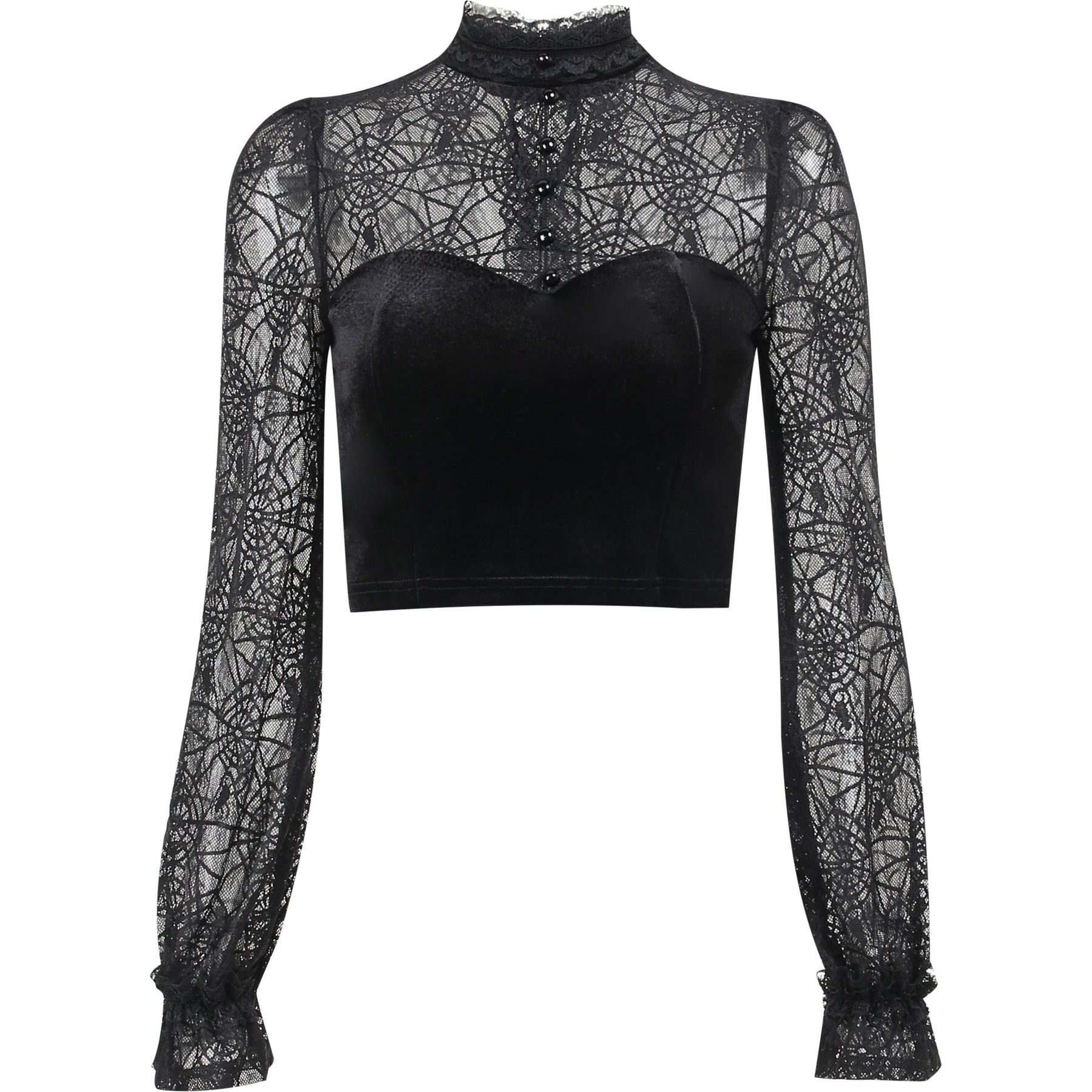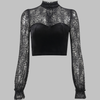 Ontworpen voor de gedurfde en moedige, past onze Gothic Top zich aan je vormen aan en benadrukt ze. De V-hals voegt mysterie toe, terwijl de kanten en gerimpelde details sensuele elegantie geven. Het fluwelen materiaal is licht elastisch, wat comfort en stijl garandeert terwijl je je uniekheid uitdrukt.
