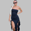 • Sensuele Details: De omhullende buste, strapless halslijn en ruches voegen een vleugje sensualiteit en originaliteit toe aan deze jurk, waardoor een harmonieuze balans tussen verleiding en elegantie ontstaat.