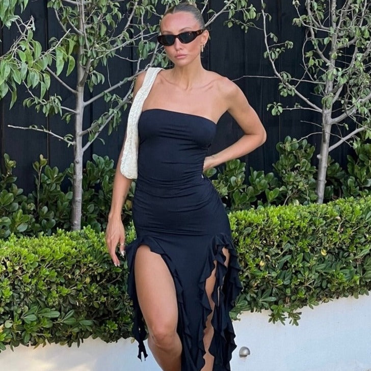 • Vleiende Vormgevende Silhouet: Het vleiende vormgevende silhouet van deze jurk accentueert je figuur, terwijl het moderniteit en vrouwelijke verleiding oproept.