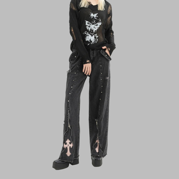 Gothic Punk Denim Broek Kruizen Studs Wijde Pijpen