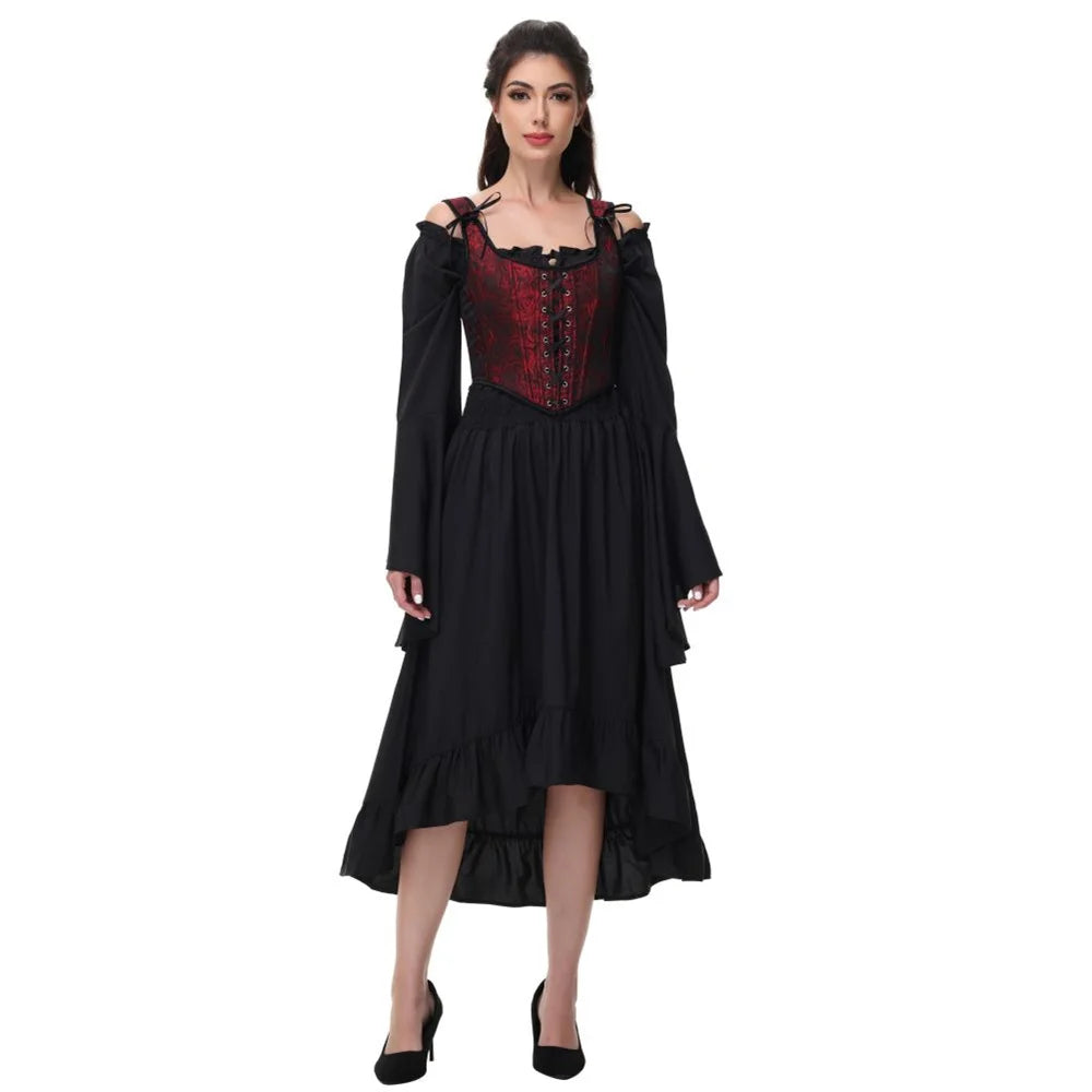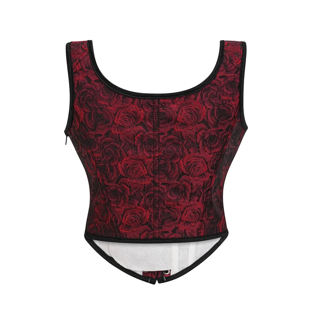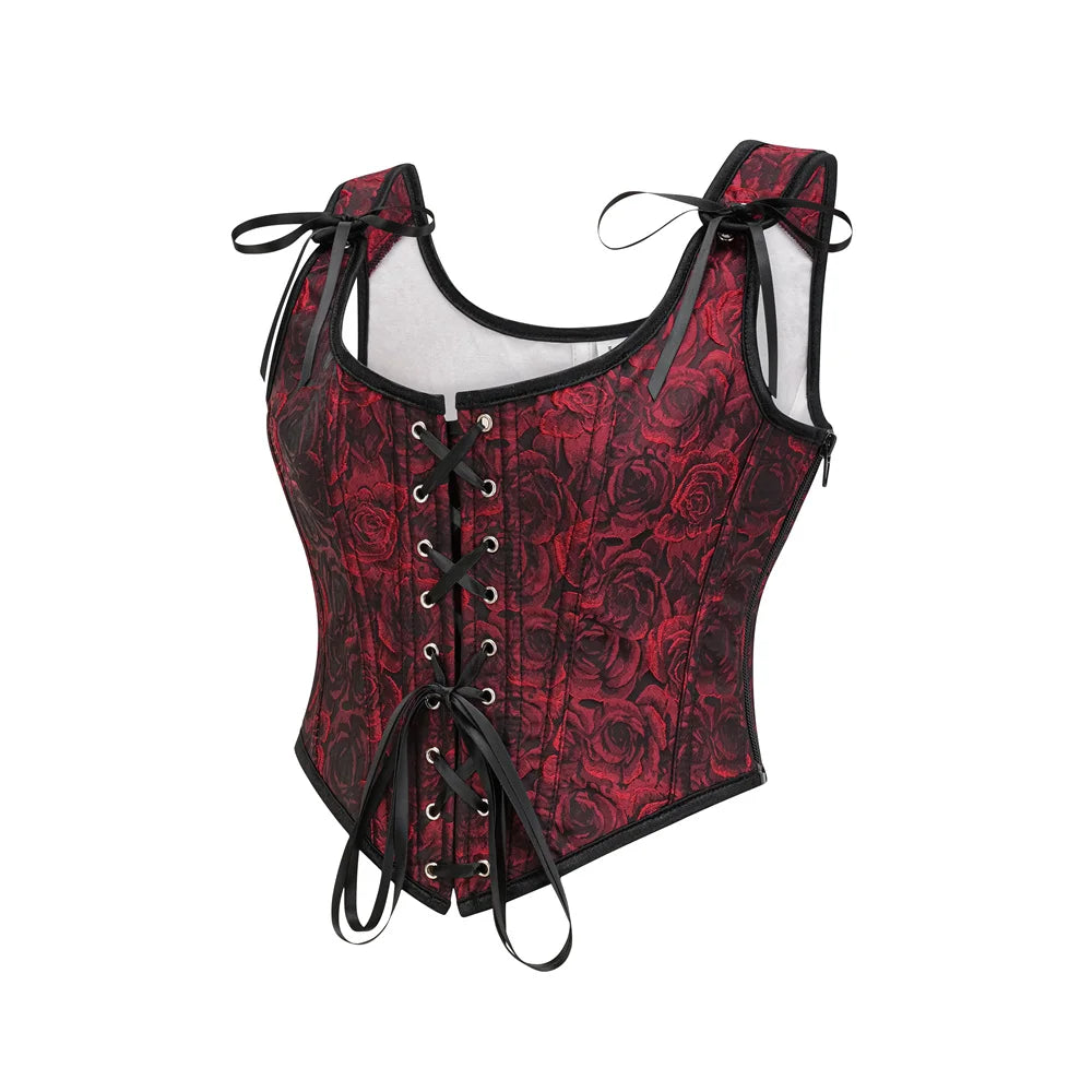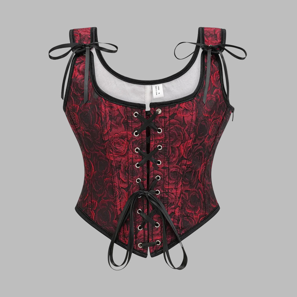 Gothic rode en zwarte korset met rozen en bandjes