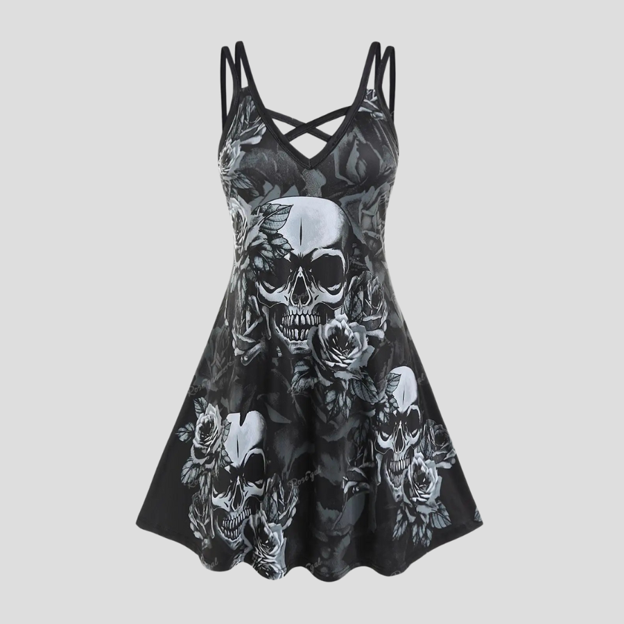 Grijze Rock Jurk Metal met Schedels en Rozen