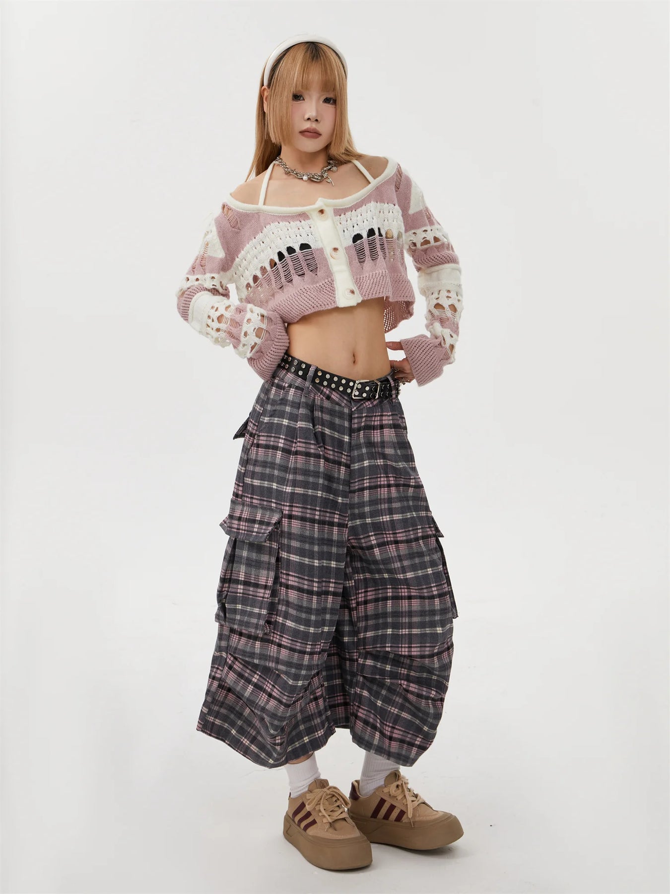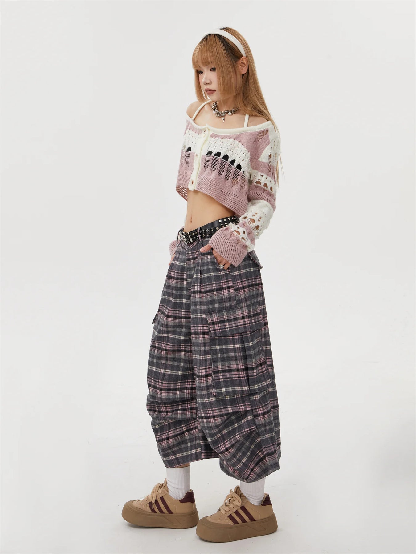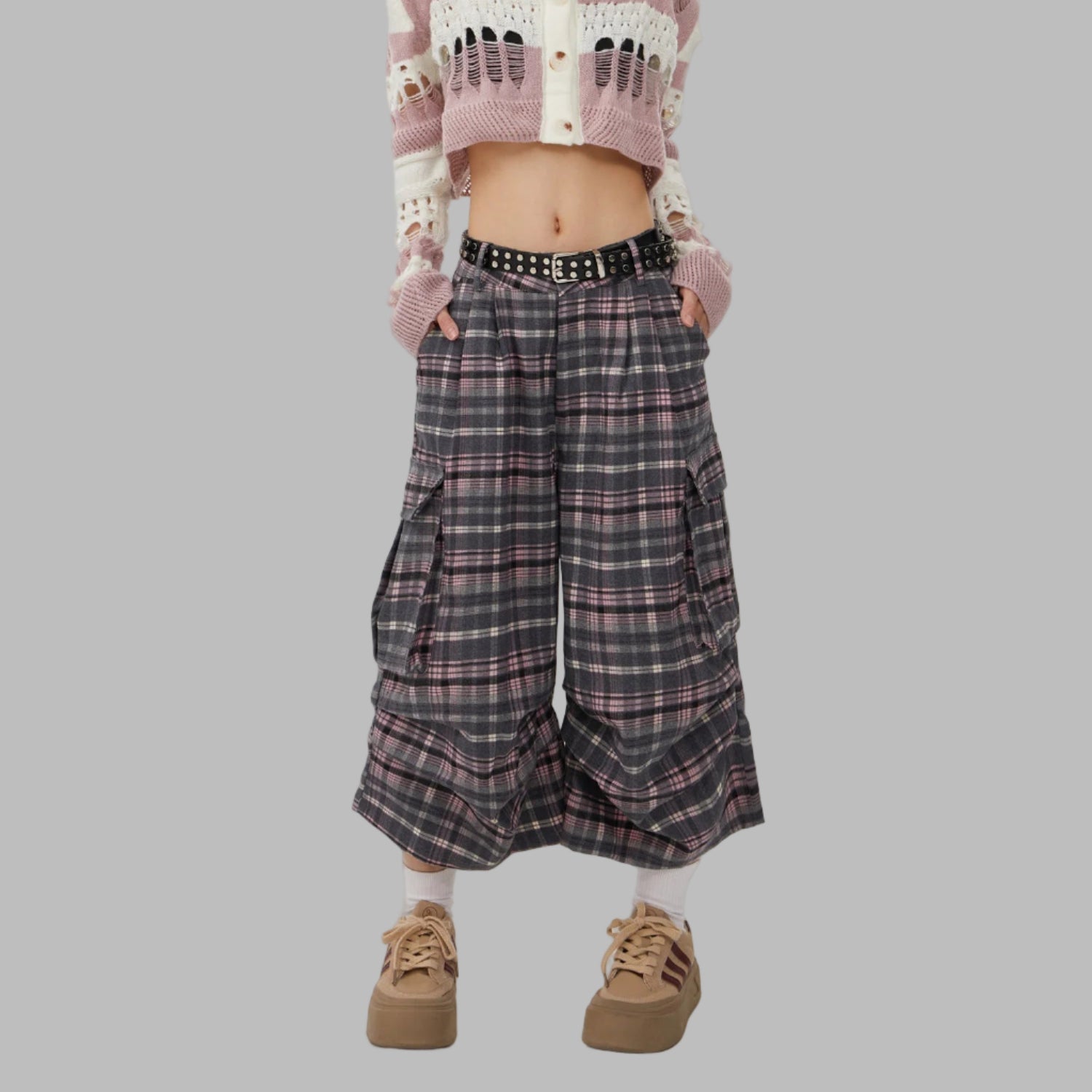 Grijze-Roze Punk Rock Geruite Broek met Kant