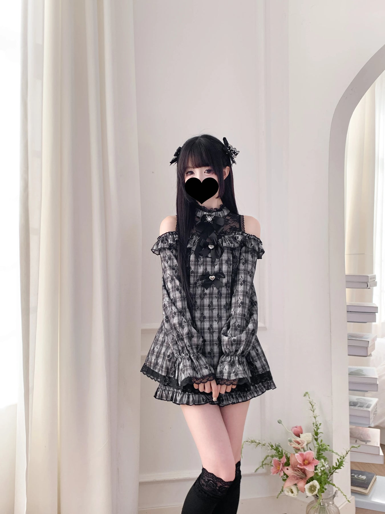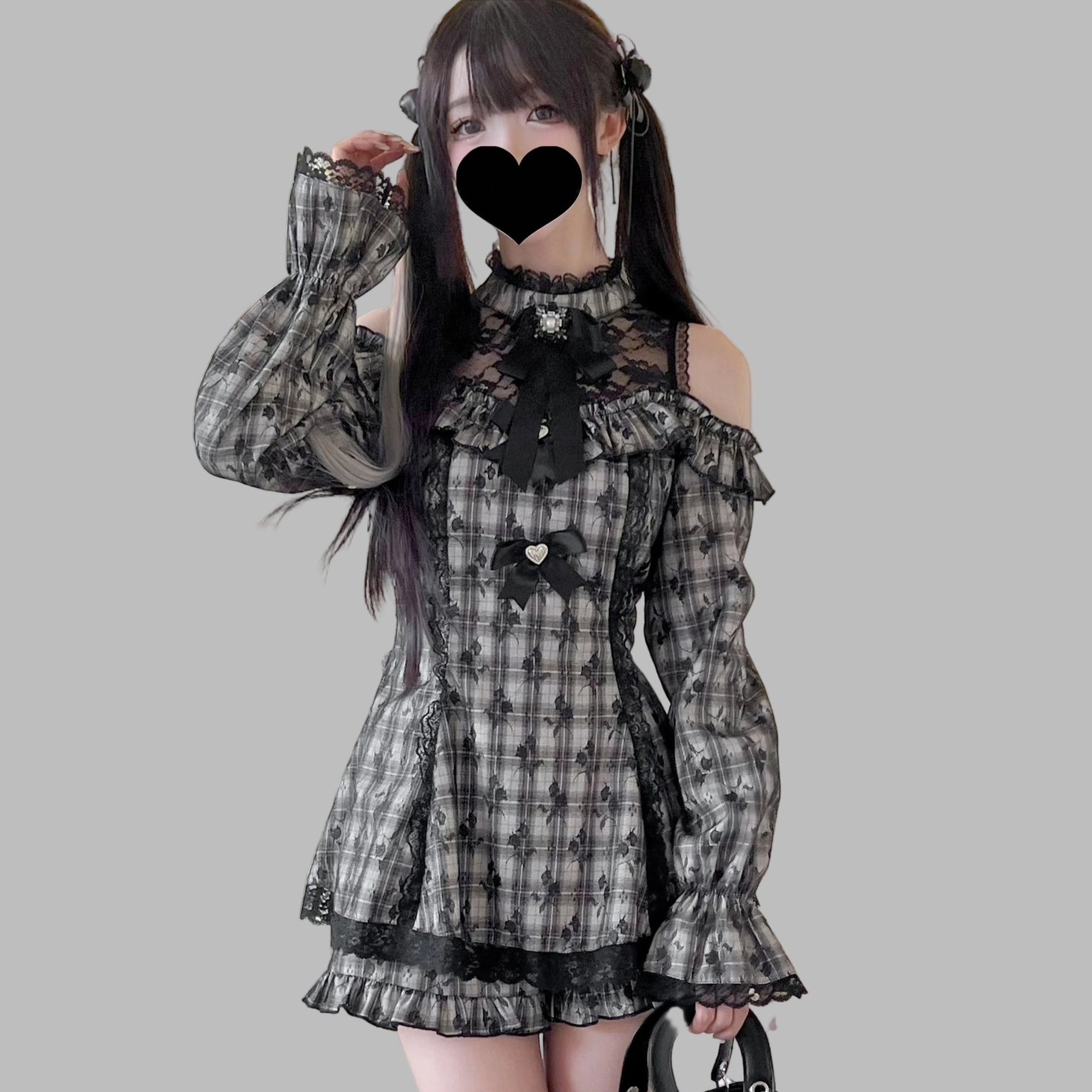 Jirai Kei Grijze Schouderloze Jurk met Kant en Ruitjespatroon
