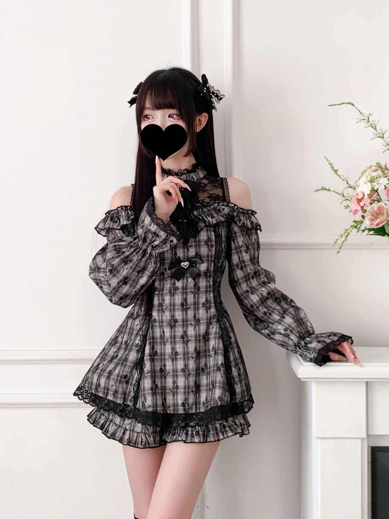 Jirai Kei Grijze Geruite Jurk met Kant en Blote Schouders Bekijk opties