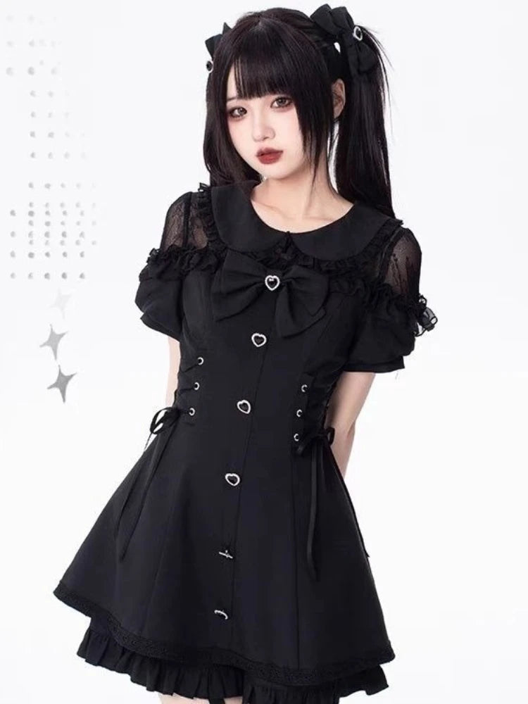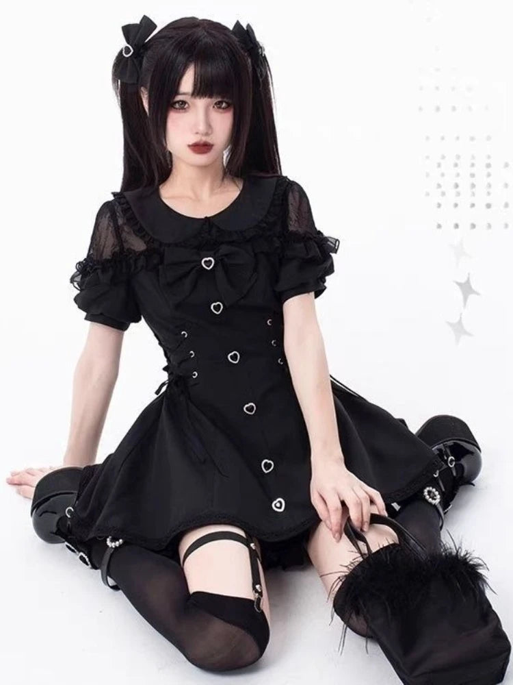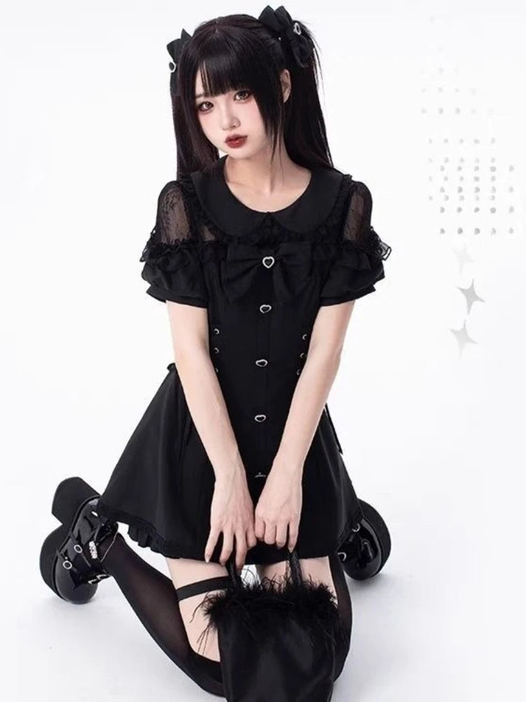 Jirai Kei Zwarte Jurk met Hartvormige Knopen en Ruches