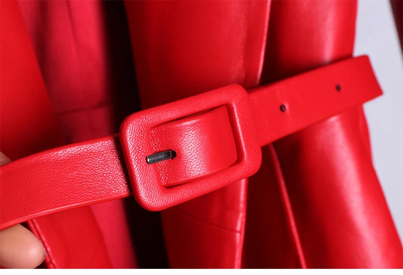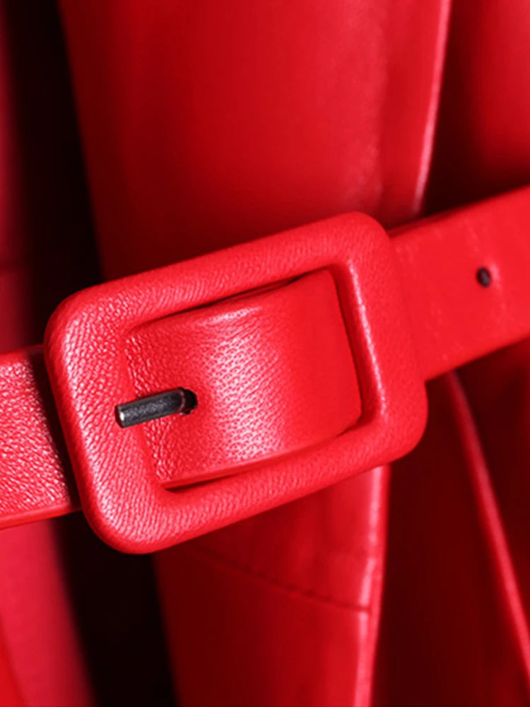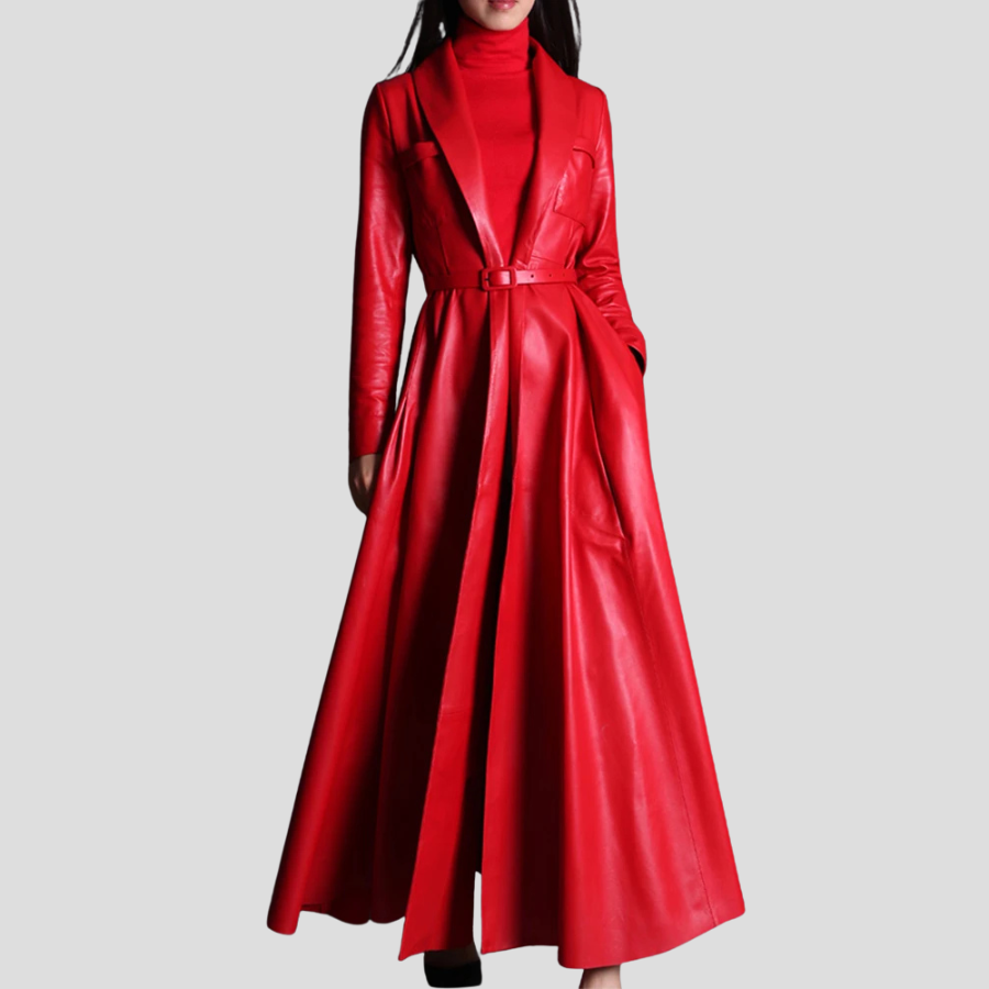Lange Rode Leren Rockjas met Riem Bekijk opties