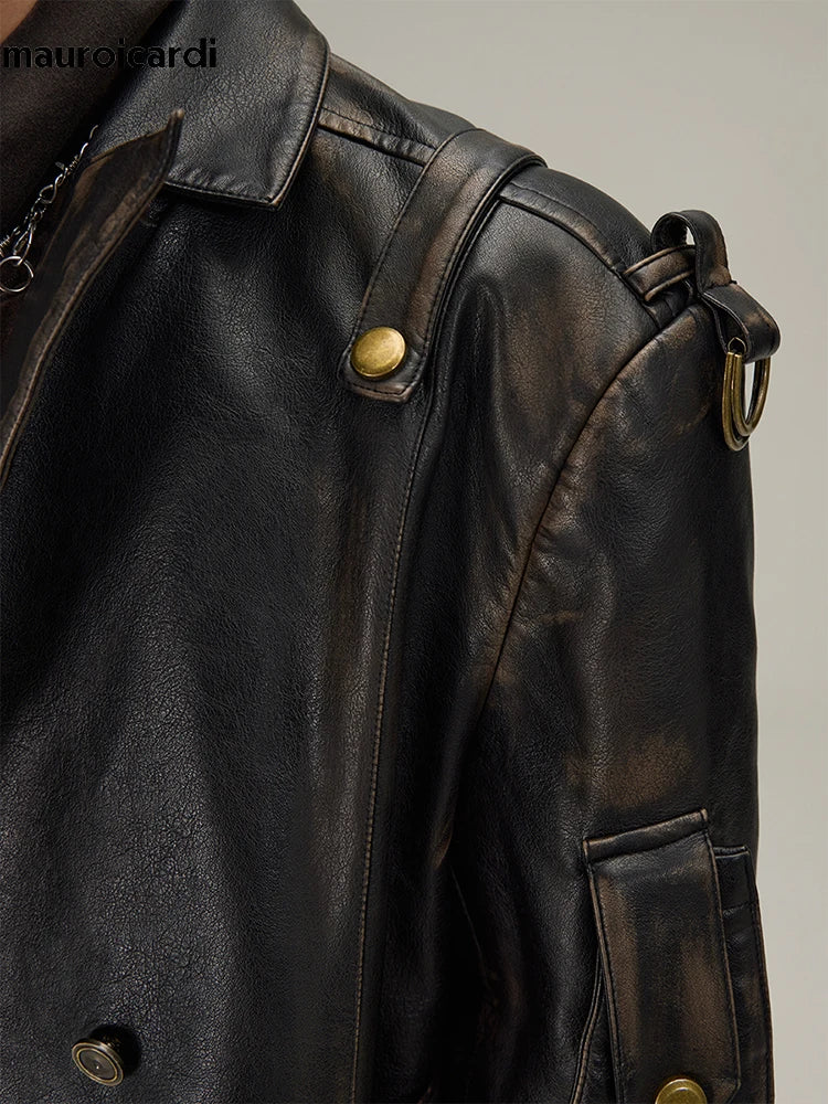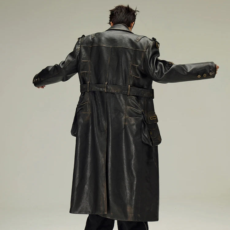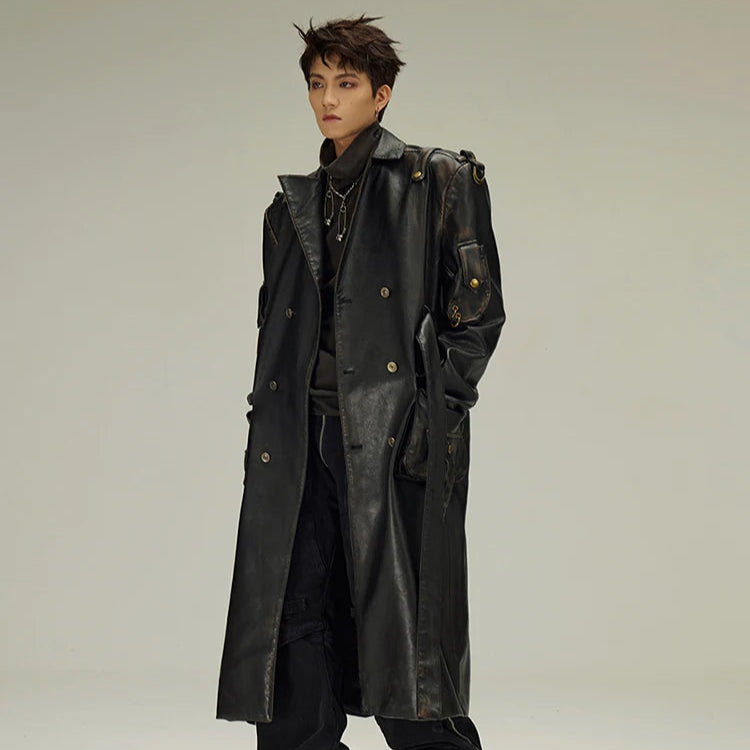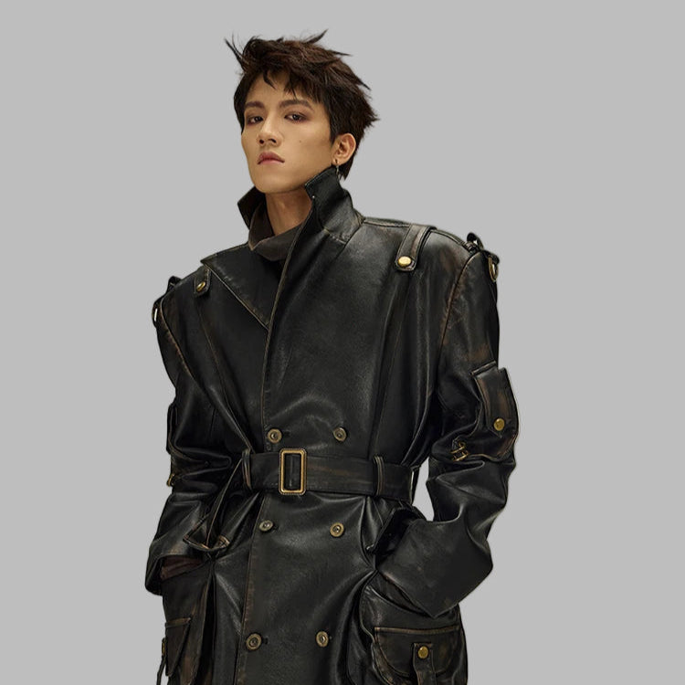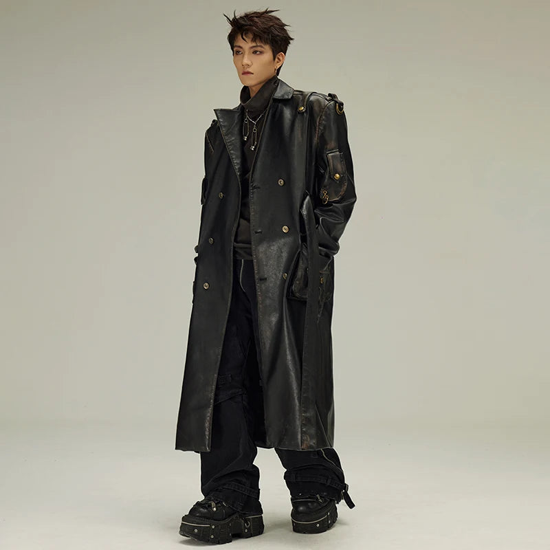Zwarte lange leren jas in gotische alternatieve stijl