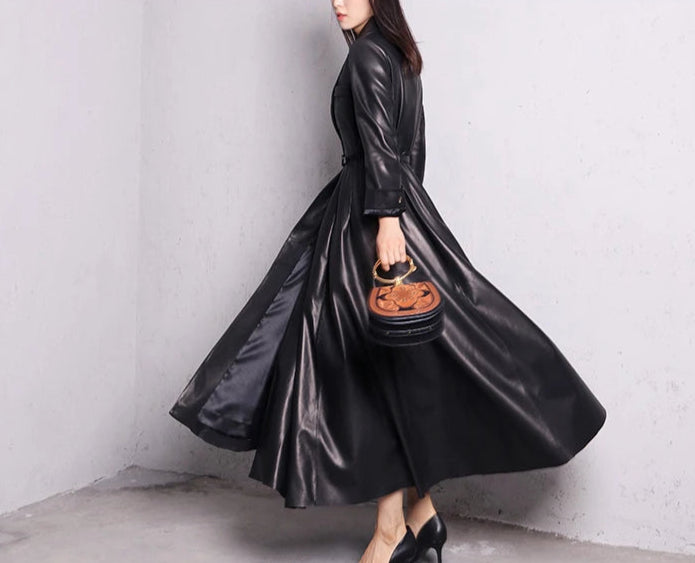 Długi Płaszcz Metal Goth Rock ze Skóry Czarny Elegancki