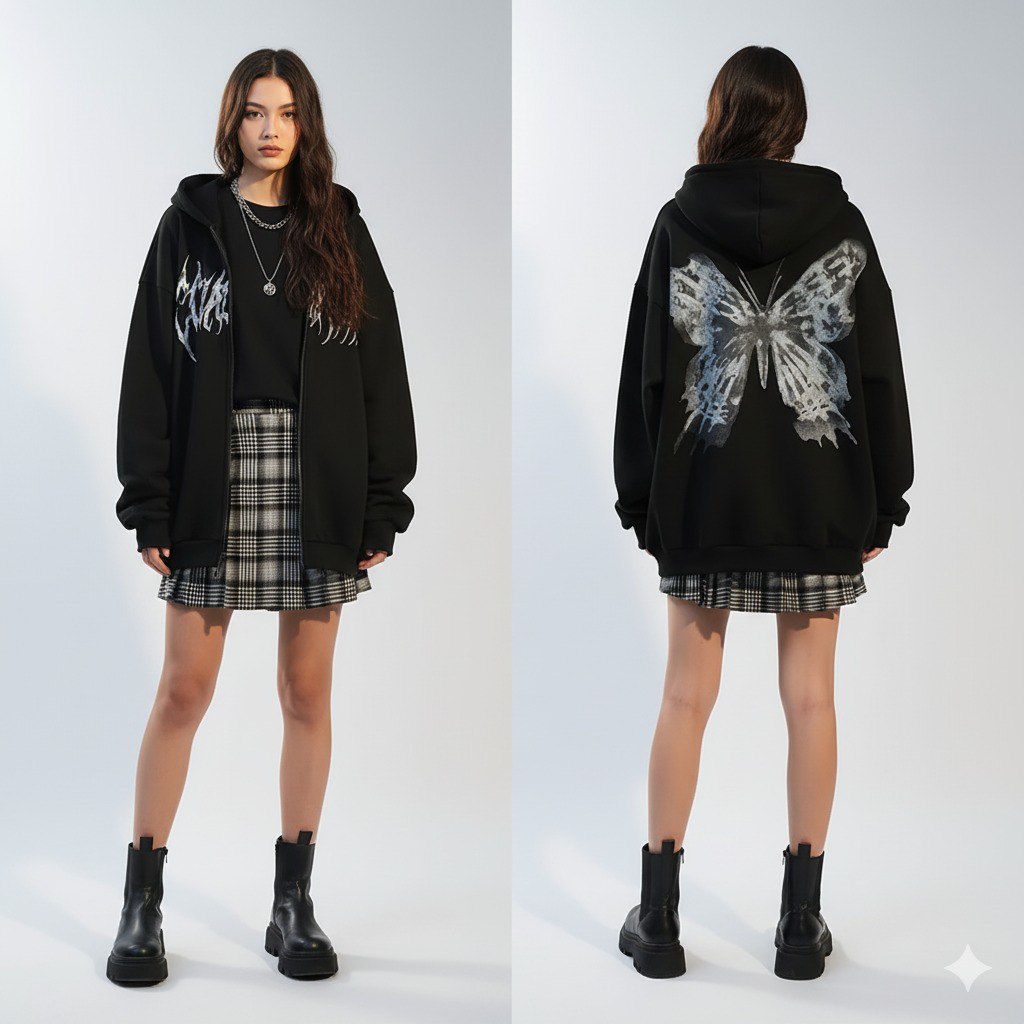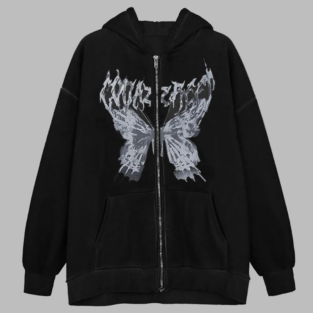 Lange Zwarte Punk Rock Hoodie met Vlinder op de Rug