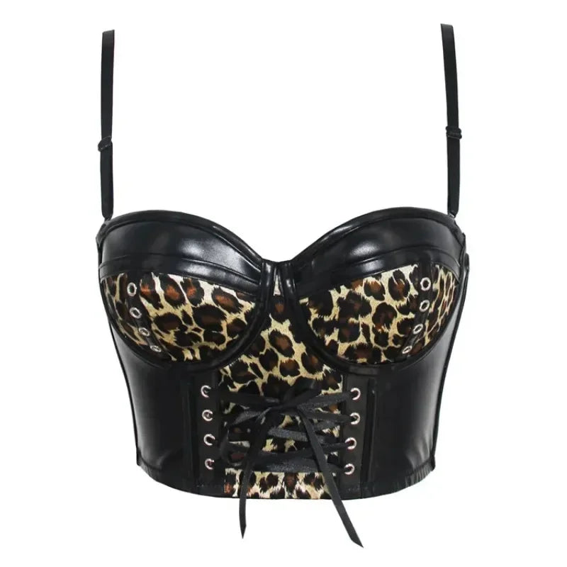 Panterenkorset met Zwarte Leren Look en Vetersluiting – Stoere Punkstijl Leopard