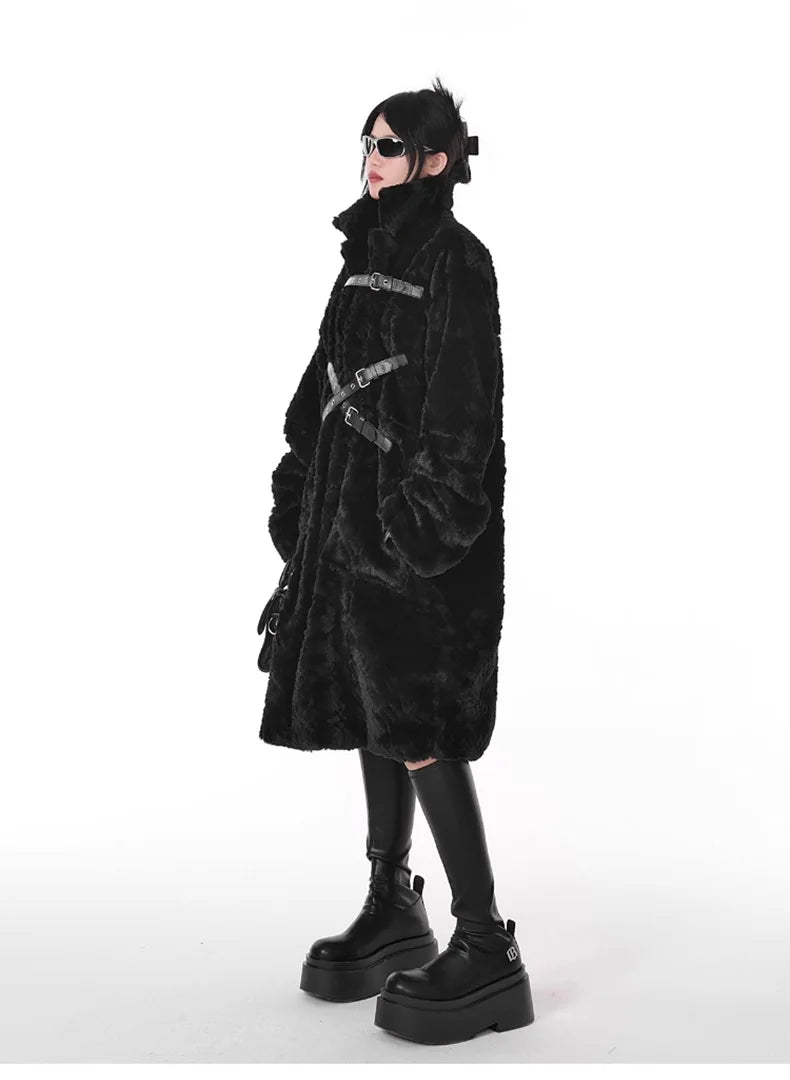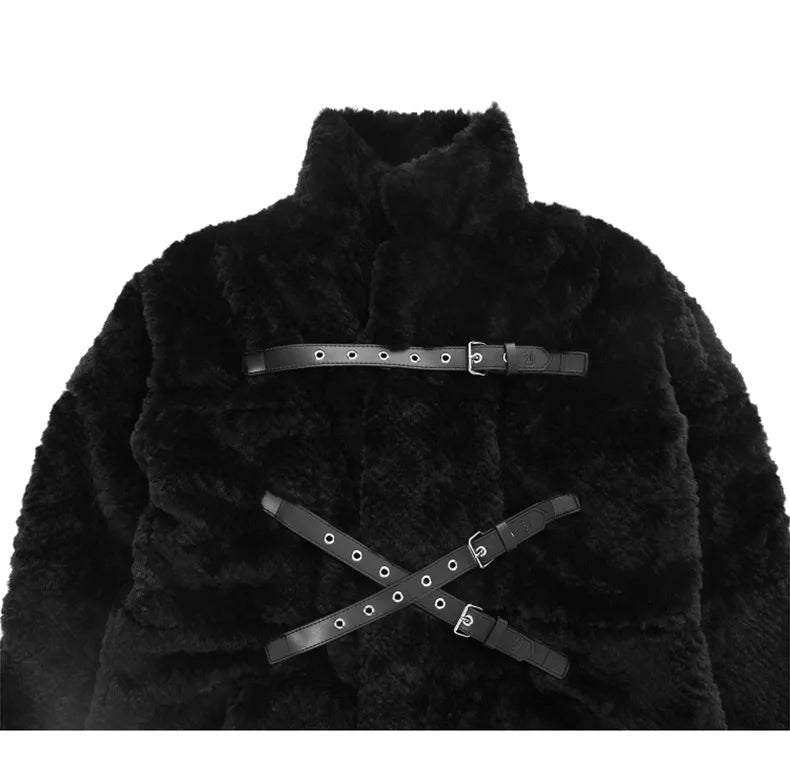 Zwarte punkmetaljas met riemen en lange bontkraag