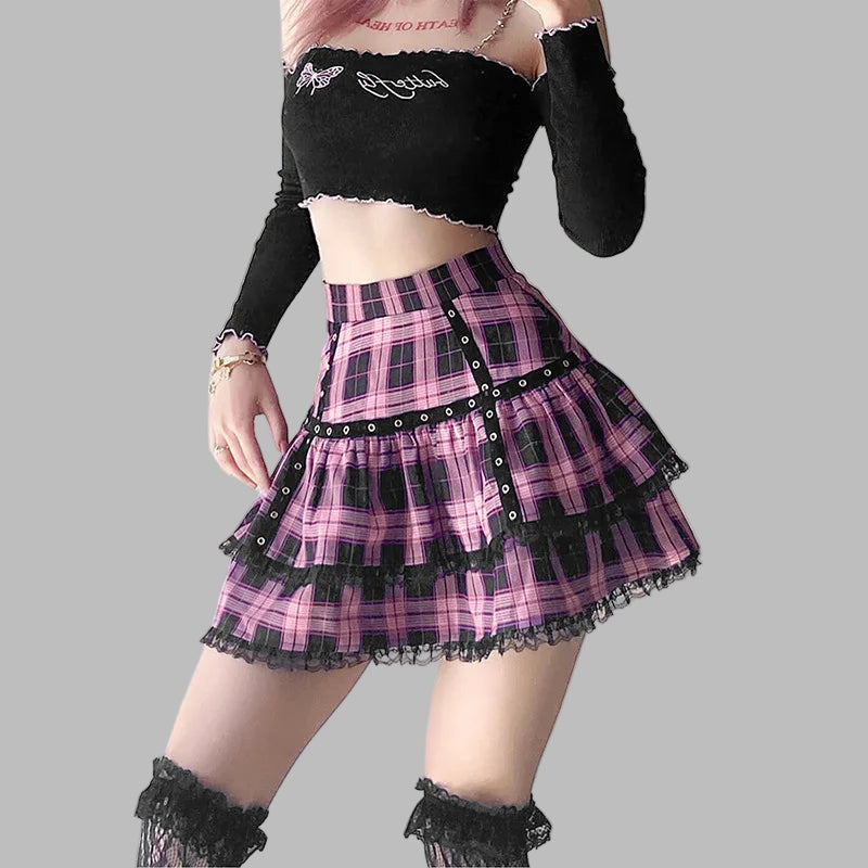 Geruite Punk Rock Grunge Rok met Kantafwerking