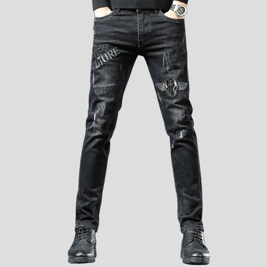 Punk Zwarte Jeans met Teksten en Vleugels Bekijk opties