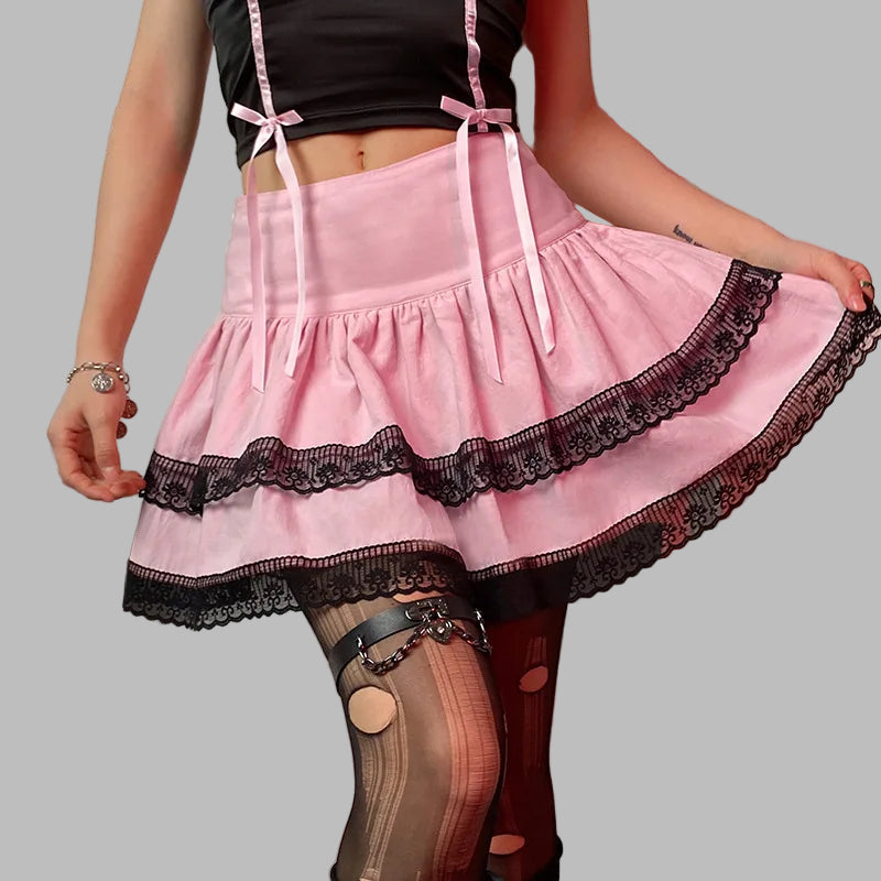 Roze Punk Jirai Kei Rok met Zwarte Kant en Ruches