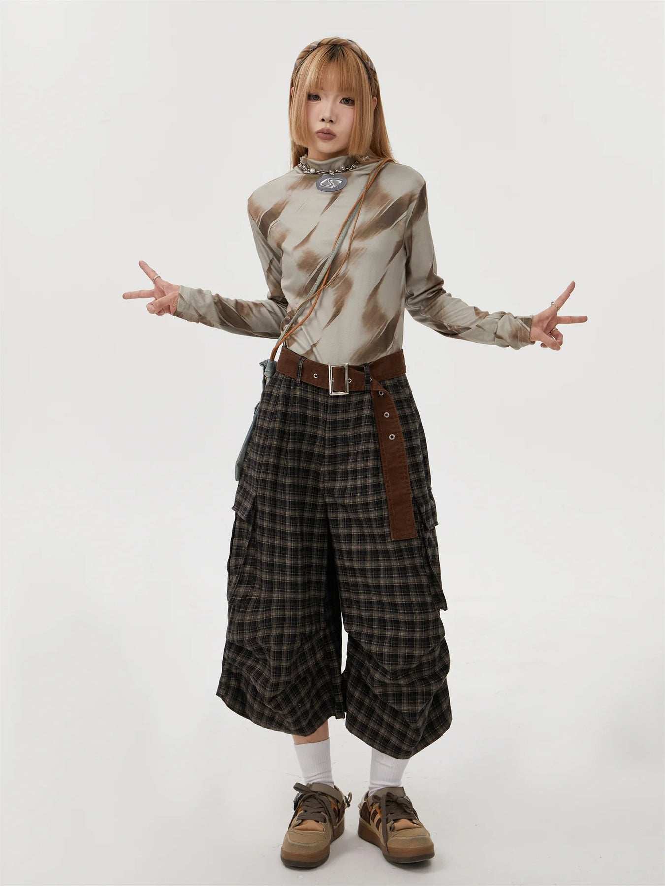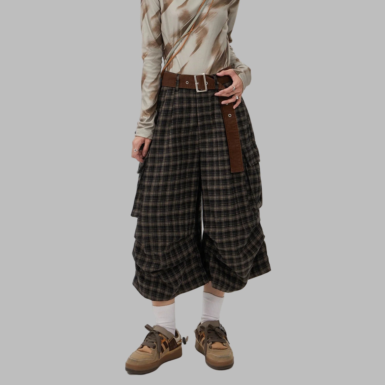 Steampunk Geruite Broek met Riem Khaki Vintage