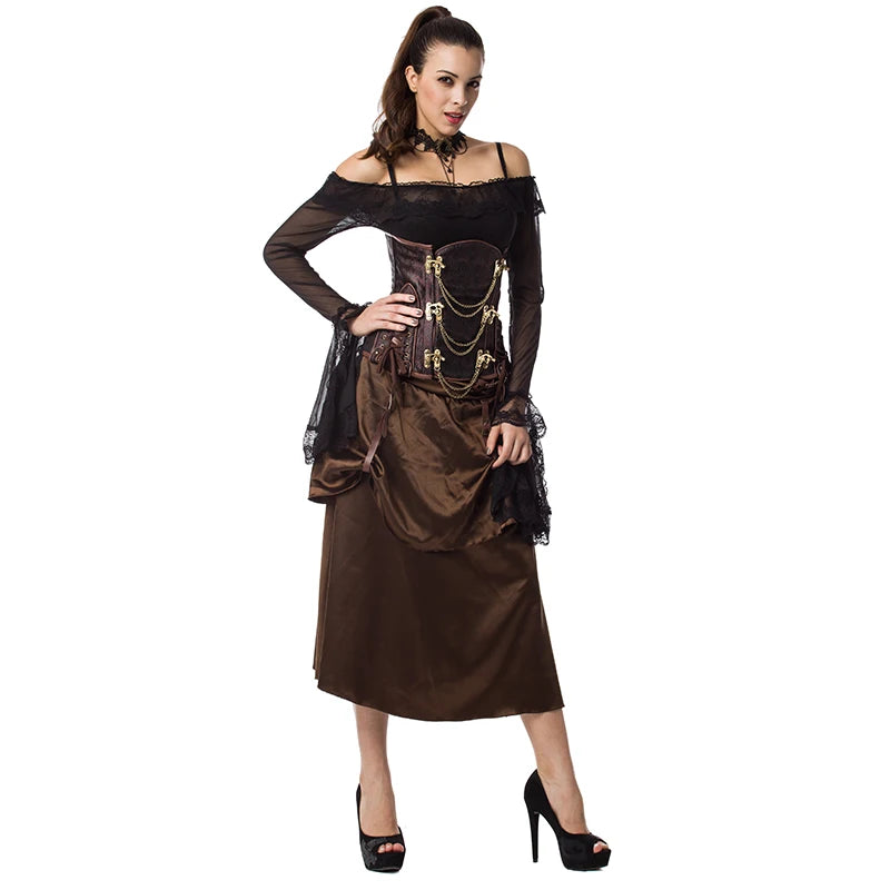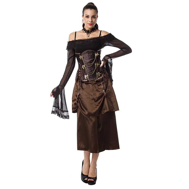 Steampunk gotisch korset bruin met kettingen en messing gespen