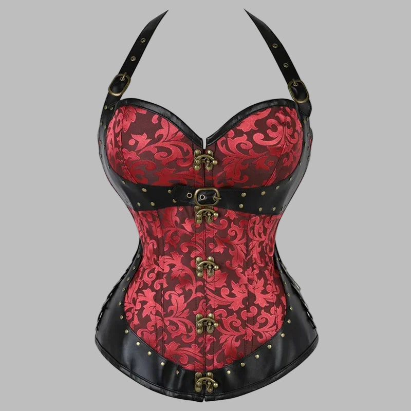 Steampunk korset rood met brokaat en zwarte leren details en gespen