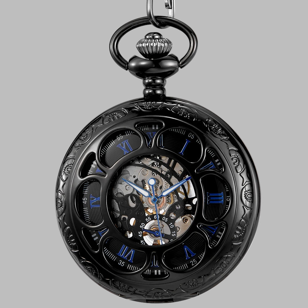 Steampunk Zwarte Mechanische Zakhorloge met Blauwe Accenten
