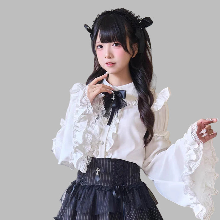 Witte Gotische Blouse met Zwarte Kant en Strik Jirai Kei Lolita