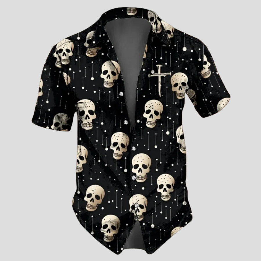 Zwart Punk Overhemd met Schedels en Kruizen Korte Mouw