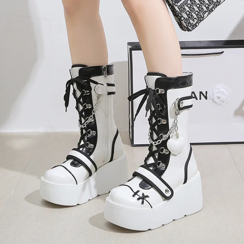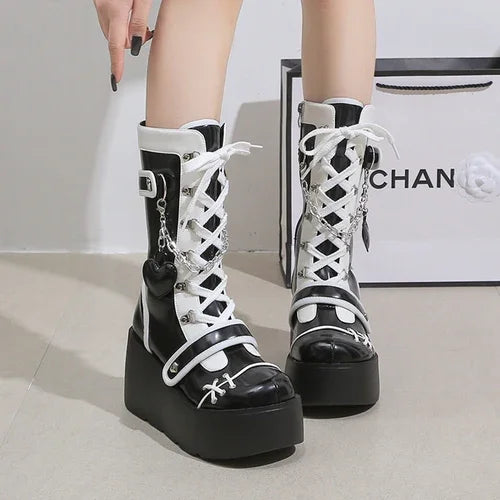 Zwart-Witte Gotische Veterlaarzen op Plateauzool