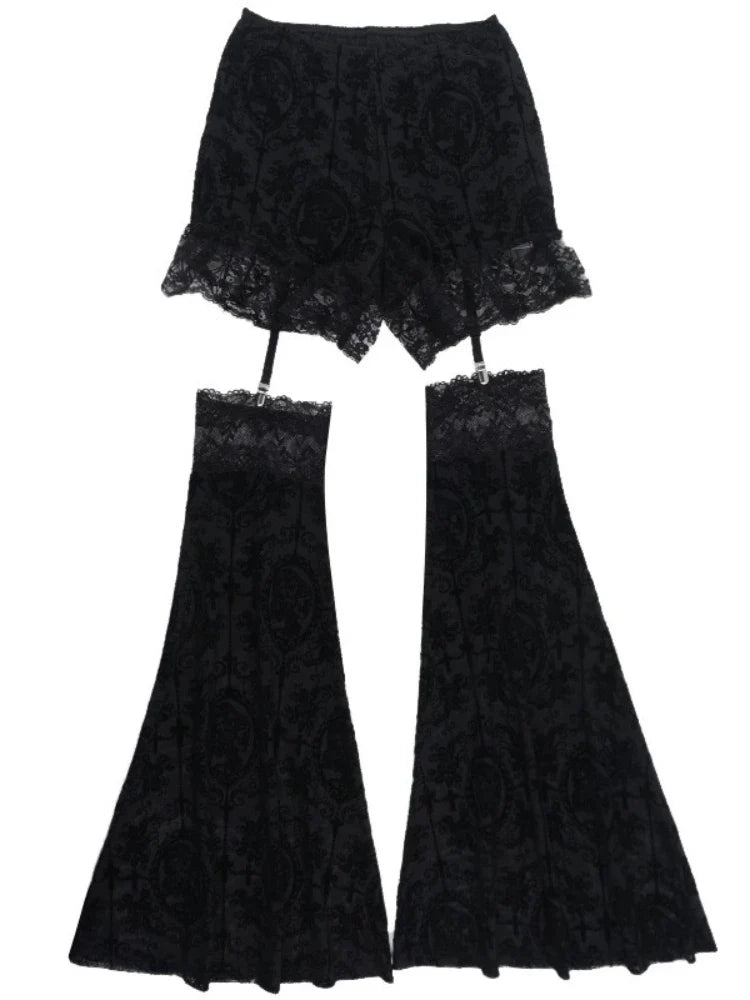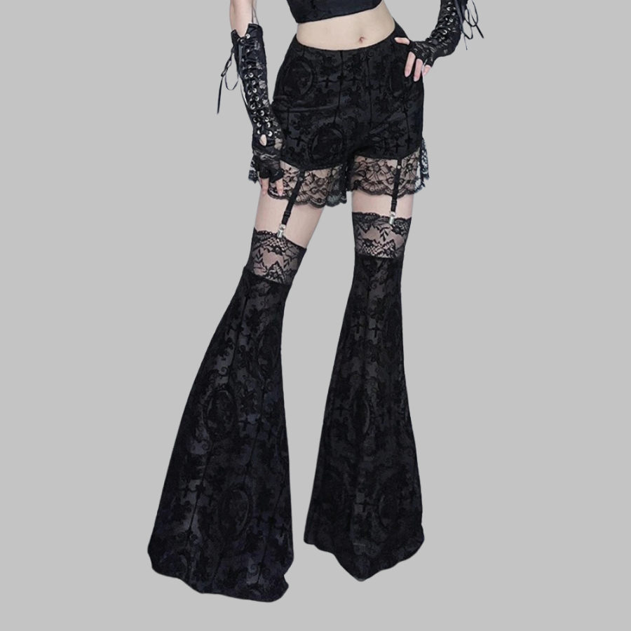 Zwarte Gotische Flare Broek met Kant en Korte Rok