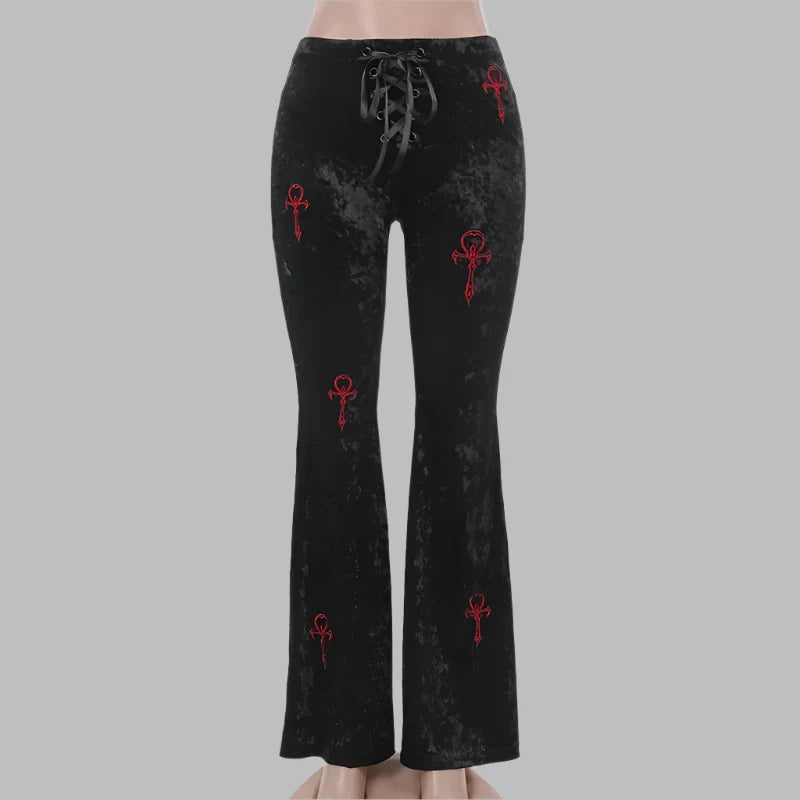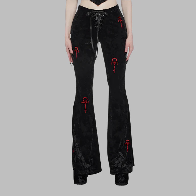 Zwarte Gotische Fluwelen Broek met Hoge Taille en Rode Geborduurde Kruizen