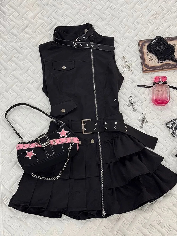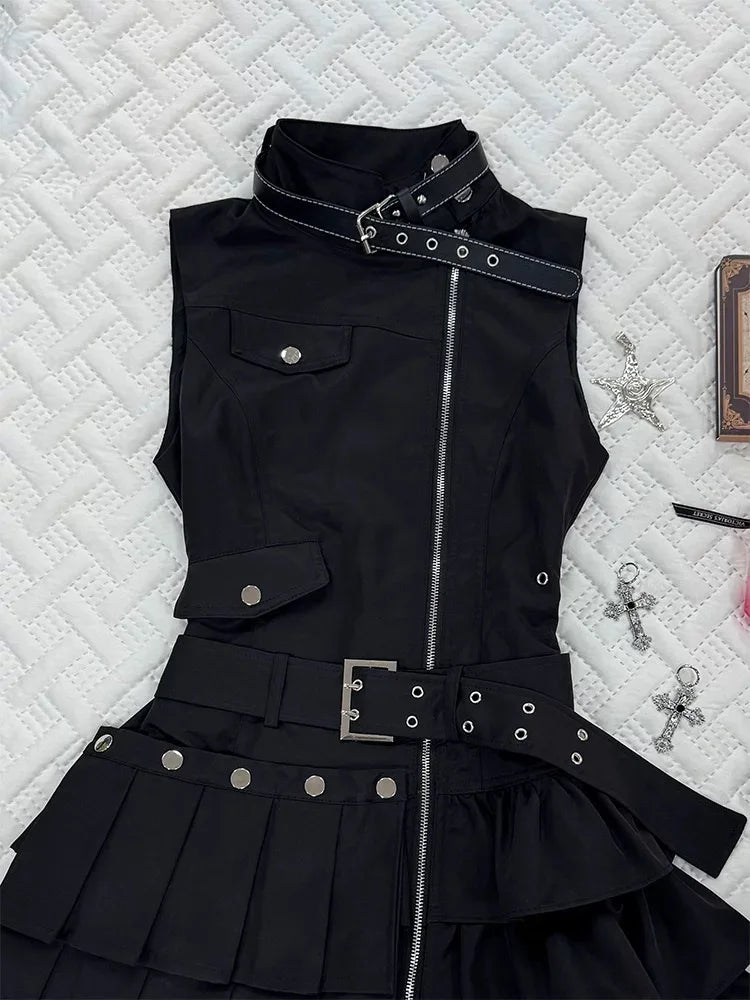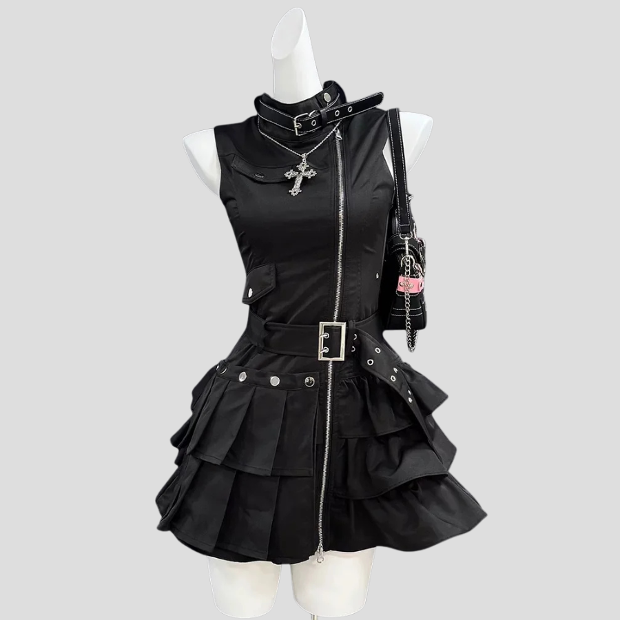 Zwarte Gotische Jurk met Rits en Ruches voor Dames