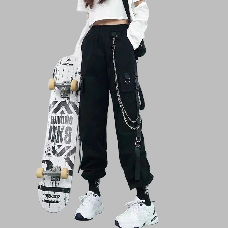 Zwarte Gothic Punk Broek met Kettingen Cargo Zakken Metaal