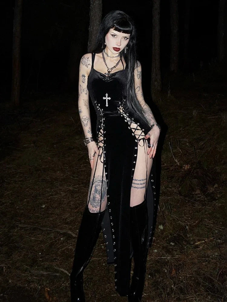 Zwarte jurk met split in grunge punk stijl met kruis en mesh