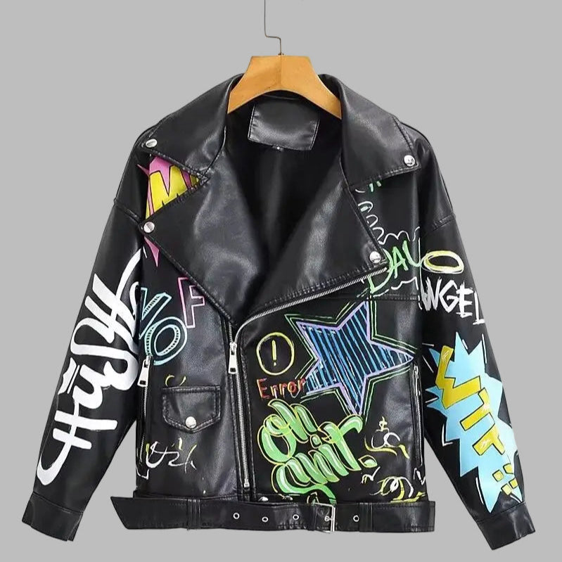 Zwarte Leren Punk Graffiti Bikerjack