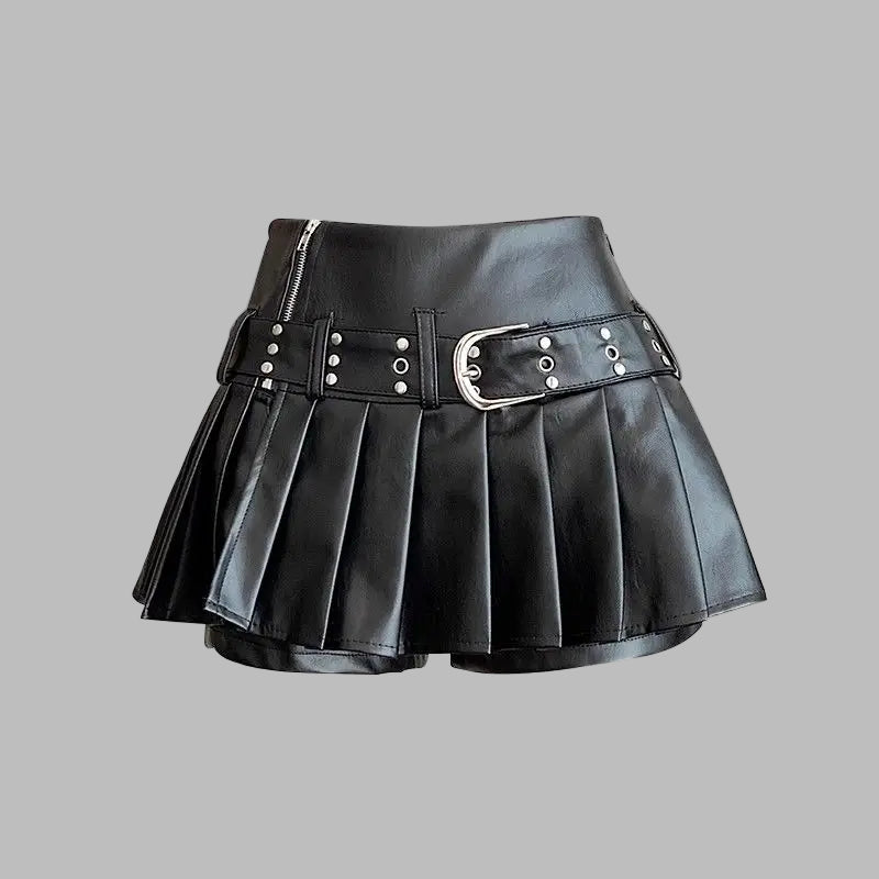 Zwarte Leren Plooirok Mini met Metalen Riem