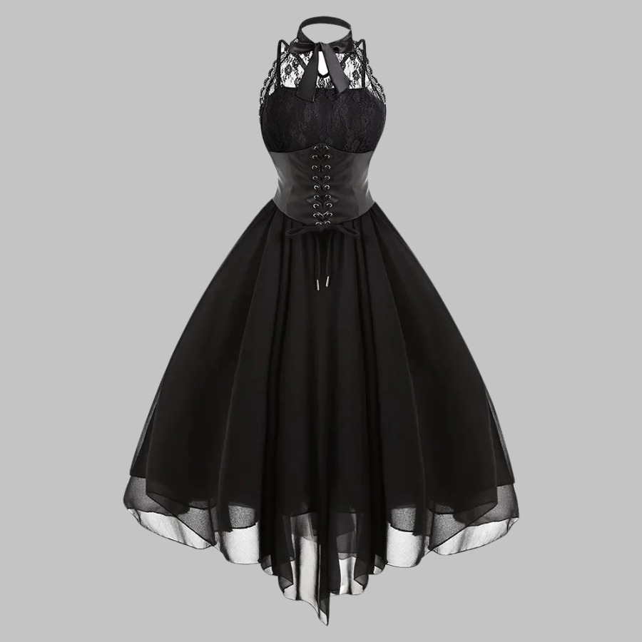 Zwarte mouwloze Victoriaanse jurk met kant en tule