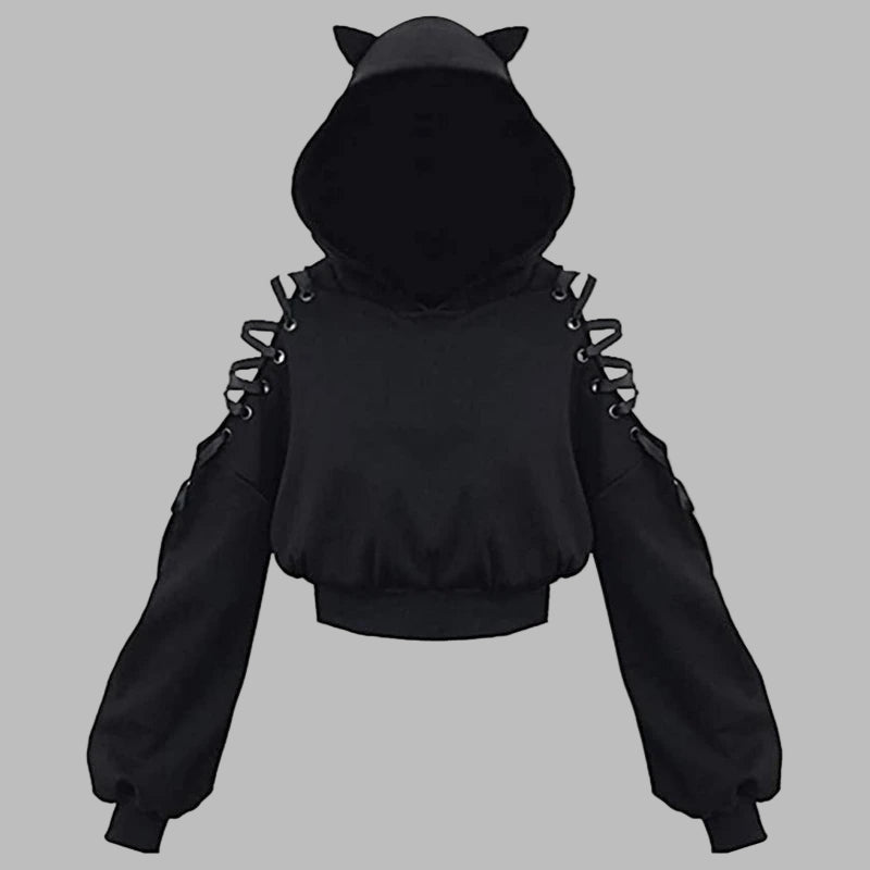 Zwarte Punk Hoodie met Hoorns en Veters op de Schouders Bekijk opties