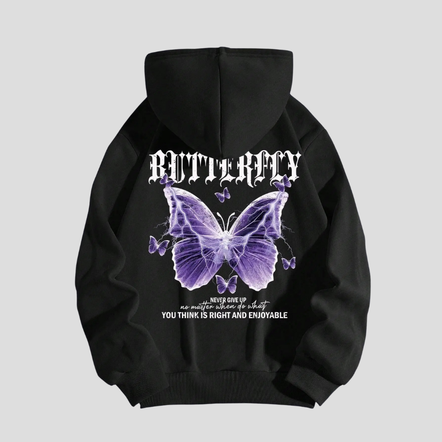 Zwarte Punk Hoodie met Paarse Vlinders en Tekst