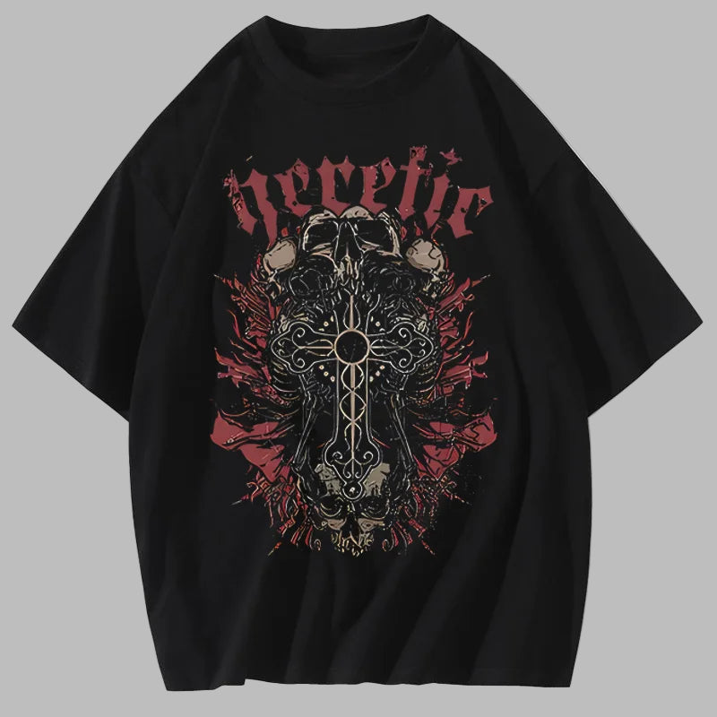 Zwarte Metal T-shirt met Kruis en Schedels